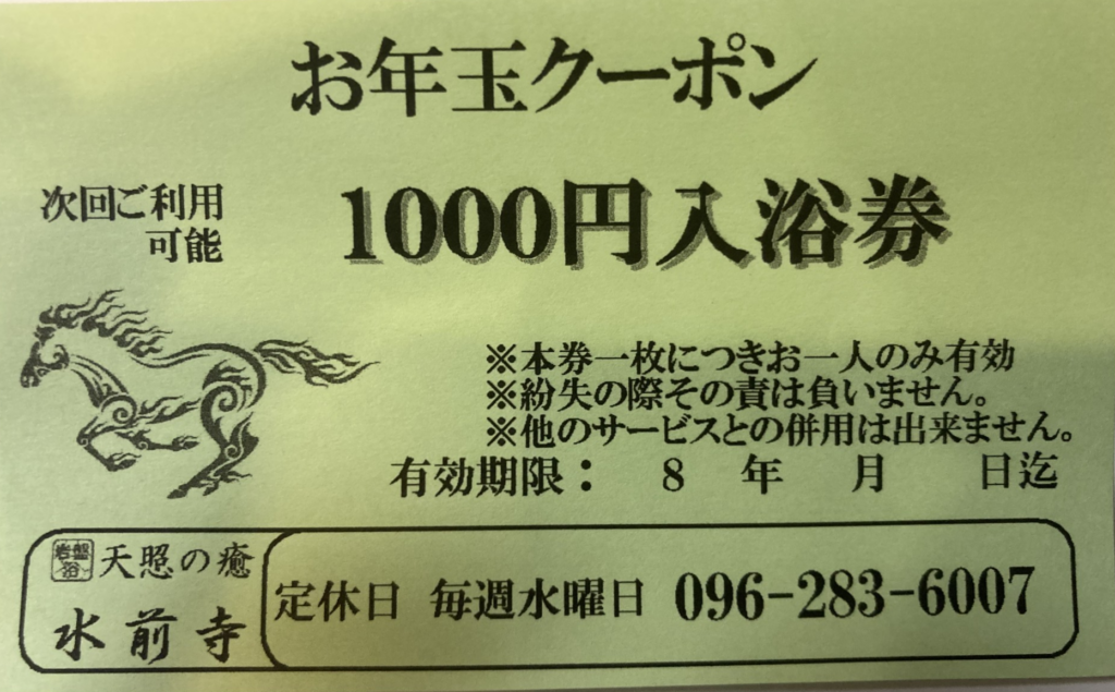 1/3(土)~1/13(火)にご来店されたお客様すべてに、次回1000円で入浴出来るクーポン券をプレゼント致します。
